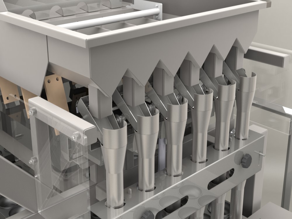 Dưới mỗi làn là các máng hoặc khay nhỏ để hứng sản phẩm topping khi rơi xuống. Tổ hợp sáu khay được gắn trên trục đỡ cứng và kết nối với hệ thống cân hai bên. Khi sản phẩm chuyển sang hệ thống cân, bộ điều khiển sẽ theo dõi trọng lượng mục tiêu và dừng bộ rung khi đạt khối lượng mong muốn.
